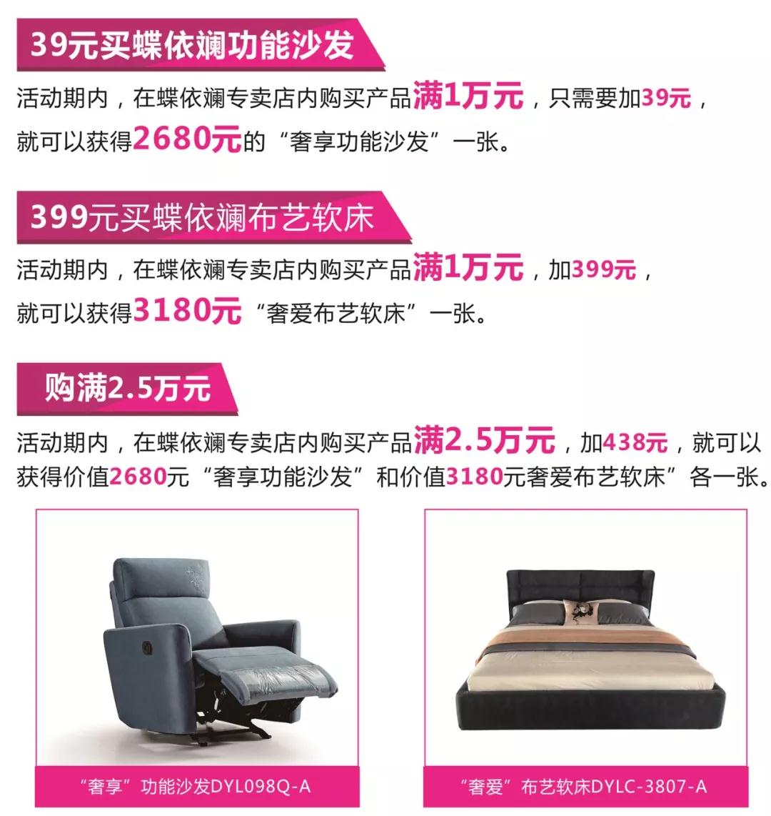 即日起至2019年8月31日,在蝶依斓软装全国200多家专卖店购买蝶依斓沙发、寝具产品满1万元,加39元 就可得2680元 的“奢享功能沙发”一张;加399元 就可得3180元 蝶依斓“奢爱布艺软床”一张,小哥哥、小姐姐们一起来盘她哦!