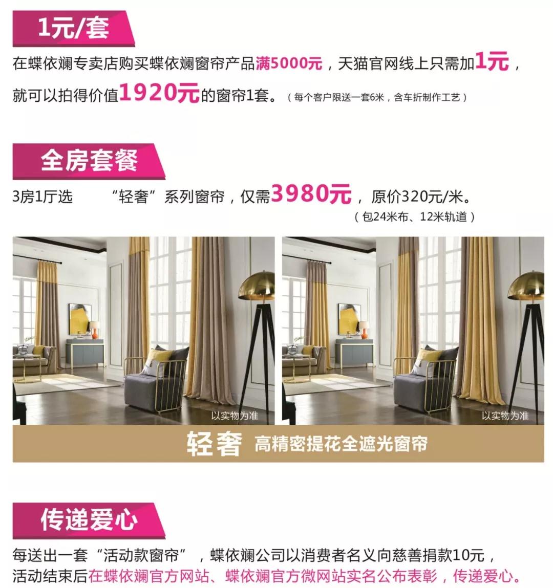好嗨哦,在蝶依斓专卖店购买蝶依斓窗帘产品满5000元,只要加1元 就能在天猫官网拍到1920元 的“轻奢”系列的高精密提花全遮光窗帘1套;三房一厅窗帘3980元全搞定!