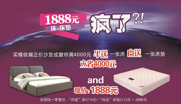 一是凡在蝶依斓全国各专卖店或天猫旗舰店、微店购买蝶依斓正价沙发或窗帘满4000元的客户,即可以1888元的价格,购买专卖价5888元的“尚爱”软床和“尚品”床垫一套,相当于半送一张床、白送一张床垫!