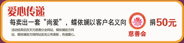 二是活动期间每成功售出一套尚爱床和床垫,将由蝶依斓出资,以客户的名义向慈善捐赠50元。活动结束后,将在慈善网站、蝶依斓官方网站、蝶依斓微网站实名公布表彰,传递爱心。