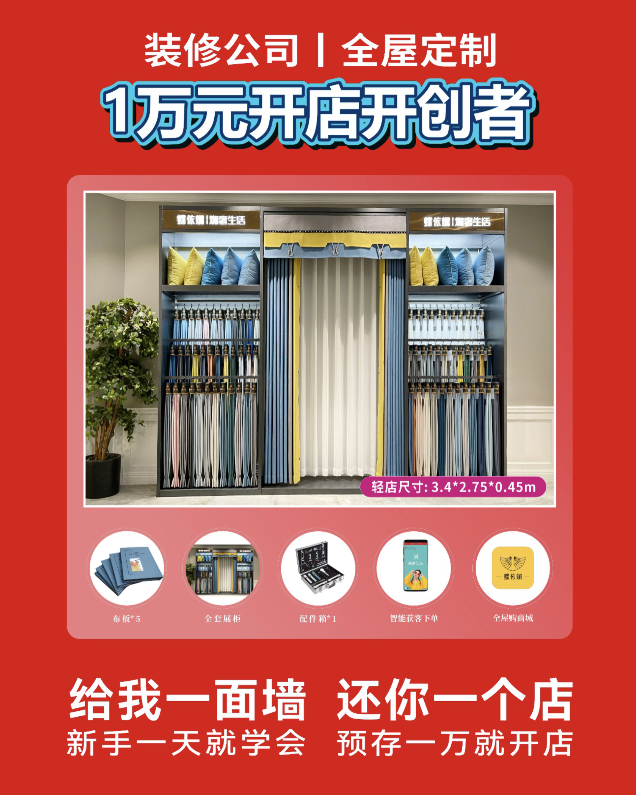 家居建材门店“苦窗帘久矣”,门店品类太单一,留不住客户,订单做不大,想增加窗帘,既不想投入太大另起炉灶,也不知道窗帘的门道,而窗帘轻店,正好解决了门店的燃眉之急,只需要一面墙,预存一万元,总部全包,帮你开好一个窗帘轻店。与门店品类融合,一站式搭配搞定,助力留客签大单。