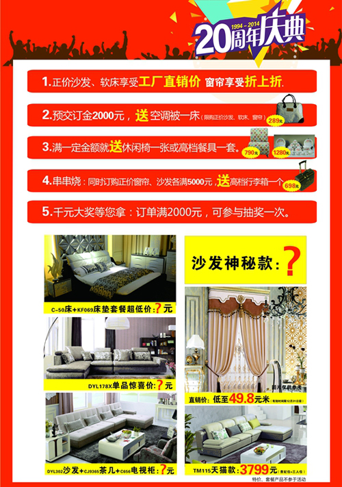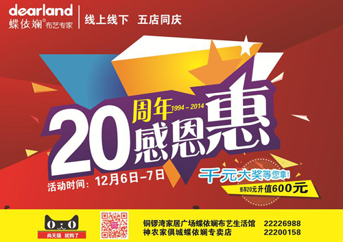 20年是一块里程碑,20年是一段奋斗史,20年更是动力源!为更多人创造幸福家居生活,我们永远在路上。蝶依斓20周年了,为了感谢20年来广大新老客户对蝶依斓的支持与厚爱,蝶依斓株洲四大直营店与蝶依斓天猫官方旗舰店5店同庆,推出2014年最重要一波钜惠活动,20周年感恩惠,活动将于12月6日至7日正式拉开帷幕。