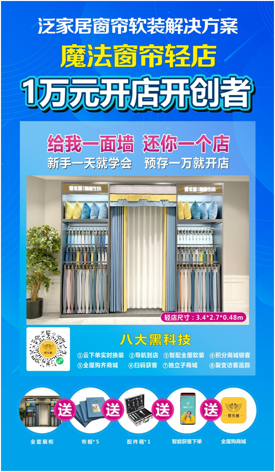 “给我一面墙,还你一个店”!“魔法窗帘轻店”打破传统窗帘经营模式,以“一面墙、一万元、一天学会”的“轻”模式,直接为家具、建材等泛家居店铺内增加一个窗帘“轻店”,为店铺提供窗帘产品和软装方案,打通店铺全屋软装一站式、全屋配套式服务。
