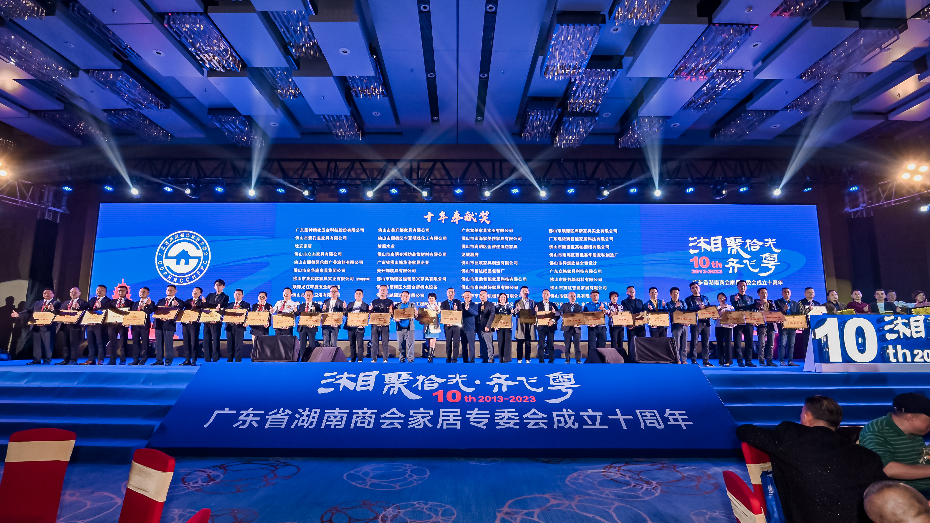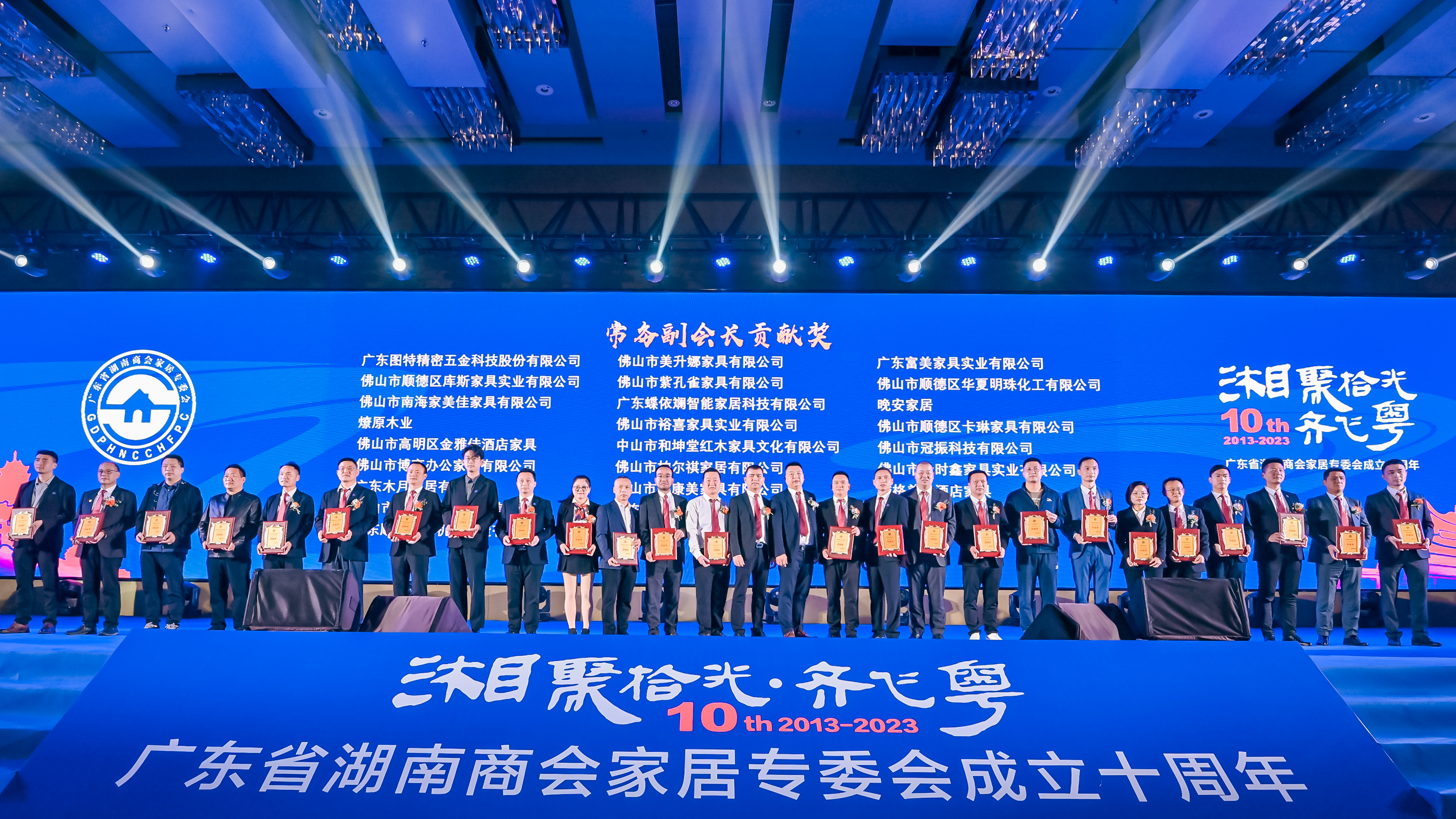 2023年12月3日,广东省湖南商会家居专委会十周年庆典在顺德龙江隆重举行。协会头部品牌、企业领袖汇聚一堂,共同为协会庆生!蝶依斓以杰出的行业成就和贡献,获协会十年贡献奖、常务副会长贡献奖!