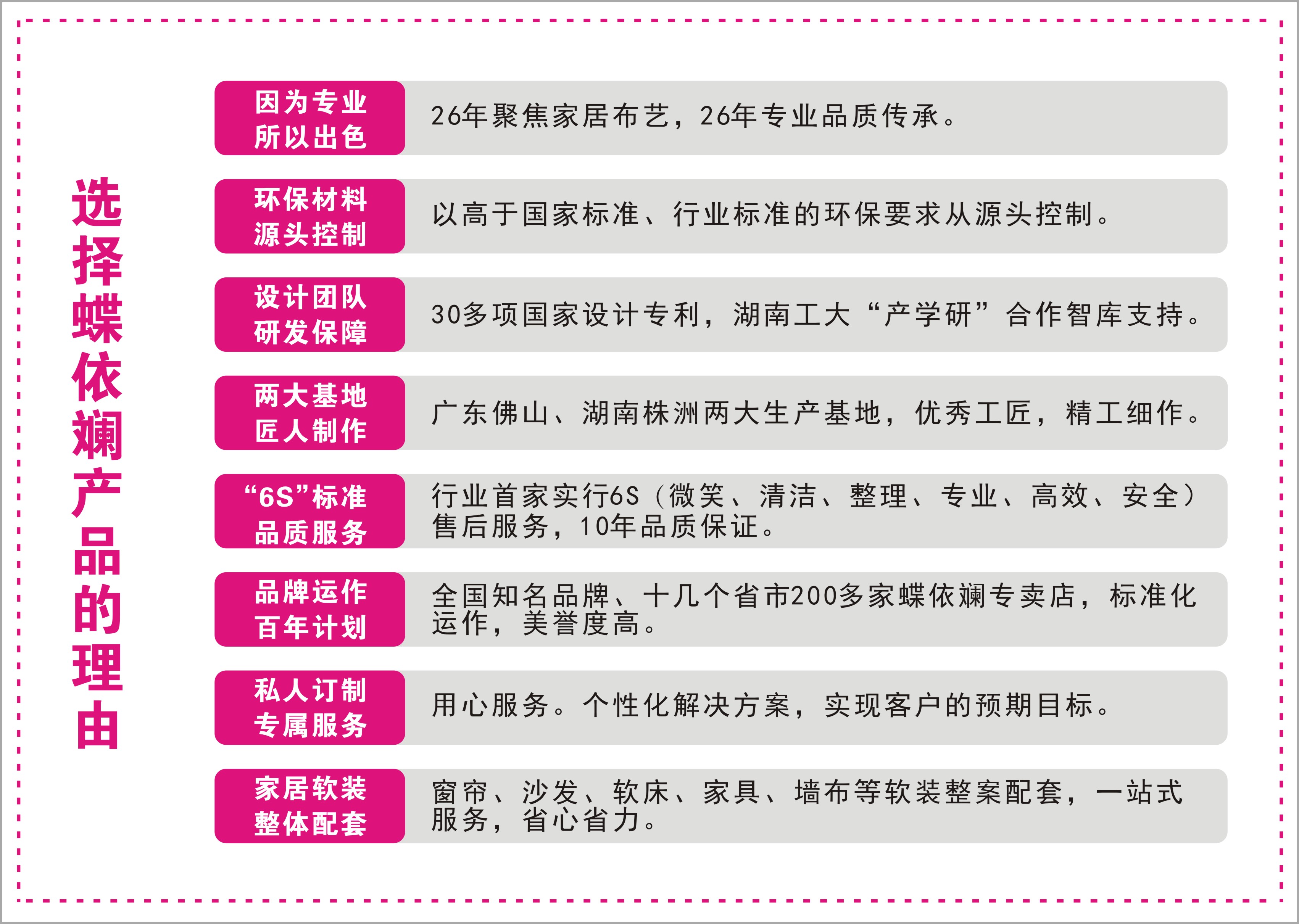 致力家居布艺,打造百年品牌。作为一家已有26年历史的家居软装品牌,蝶依斓在业内一直以产品质量过硬、产品售后服务周到而广为人知,深受好评。5月16日,湖南省室内装饰协会2019年度行业表彰暨2020年双年展启动和设计分享大会在湖南长沙举行,蝶依斓荣获“2019年度湖南省室内装饰行业优秀装饰材料供应商”。
