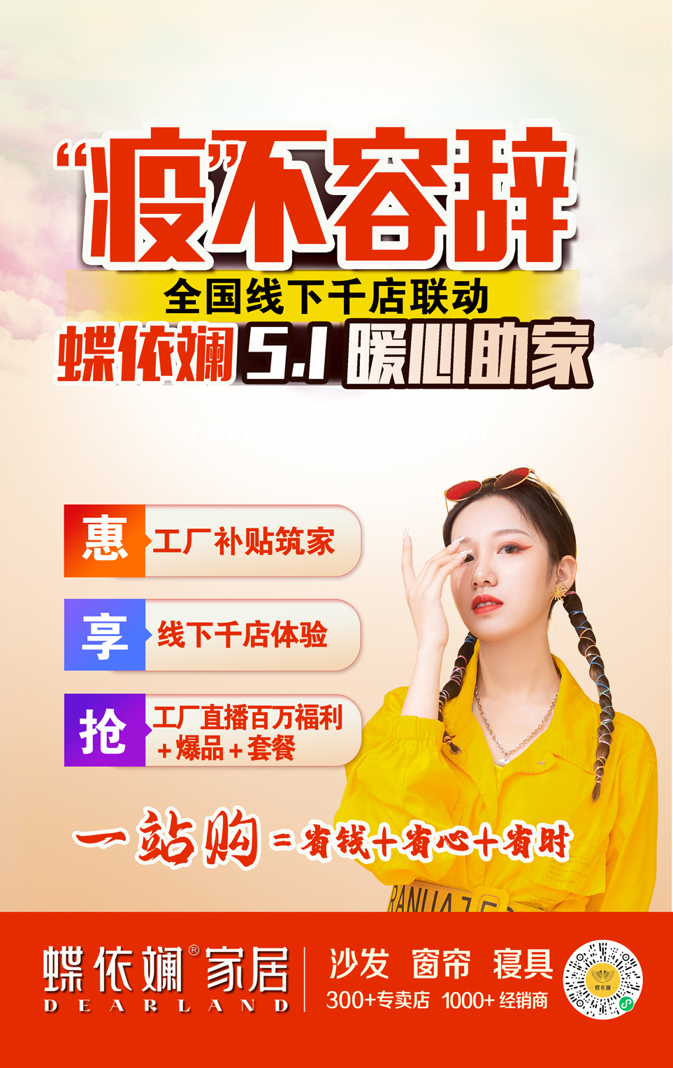 同心抗疫,共克时艰,蝶依斓以28年品牌行业沉淀和实力,稳中求变,以创新思维破局,拓展家居、窗帘新零售模式营销线,以智慧、数字化、流量化转型重塑传统线下门店。在此次5.1“暖心助家”全国千店联动中,也体现了蝶依斓打通线上线下、深耕用户需求、同心抗疫与线下门店共进退的决心。
